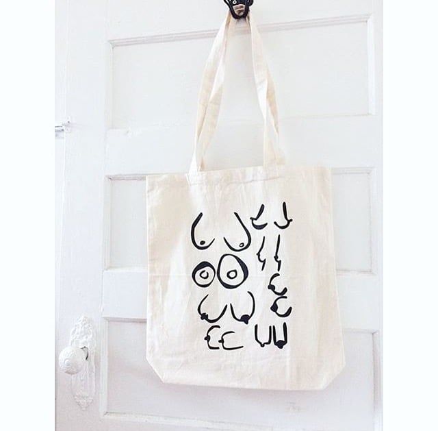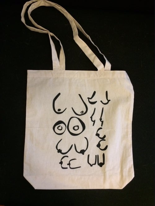 This canvas tote bag was hand printed with an original illustration. Each tote depicts a boob print showing all shapes and sizes.